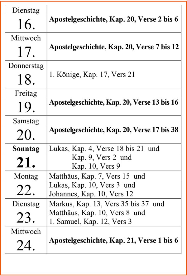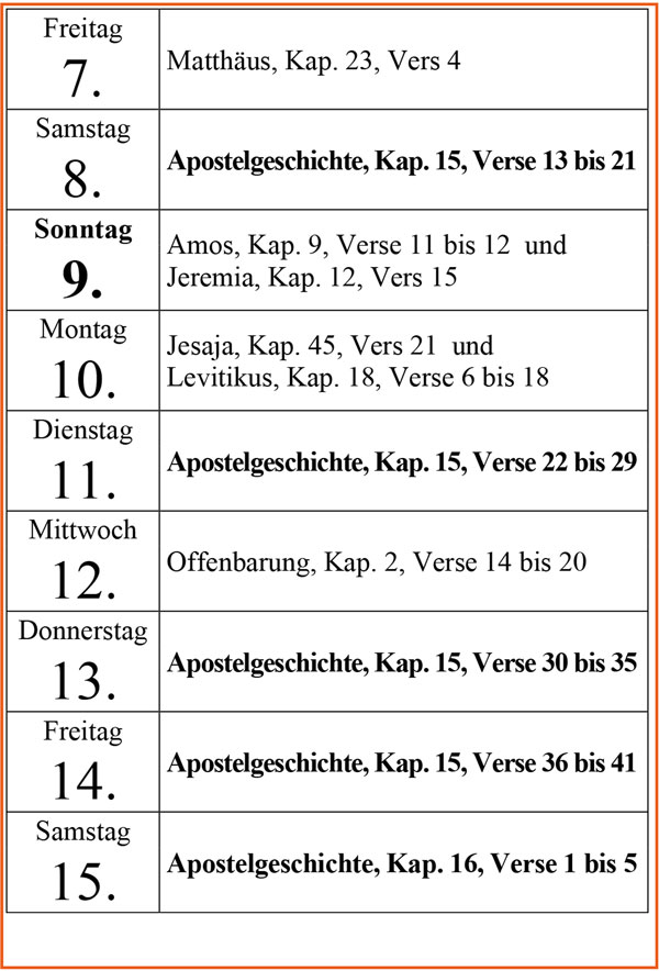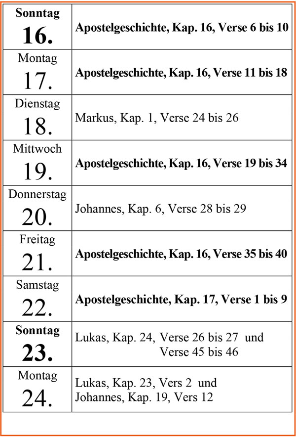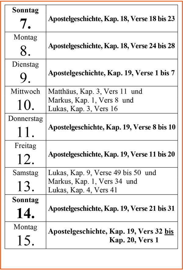 In den letzten Jahren haben wir im Rahmen des Plans die "Erste Lesung" des Tages lt. der offiziellen Leseordnung der Katholischen Kirche gelesen. Davor haben wir die komplette Bibel (Altes und Neues Testament) als Bahnenlesung gelesen.